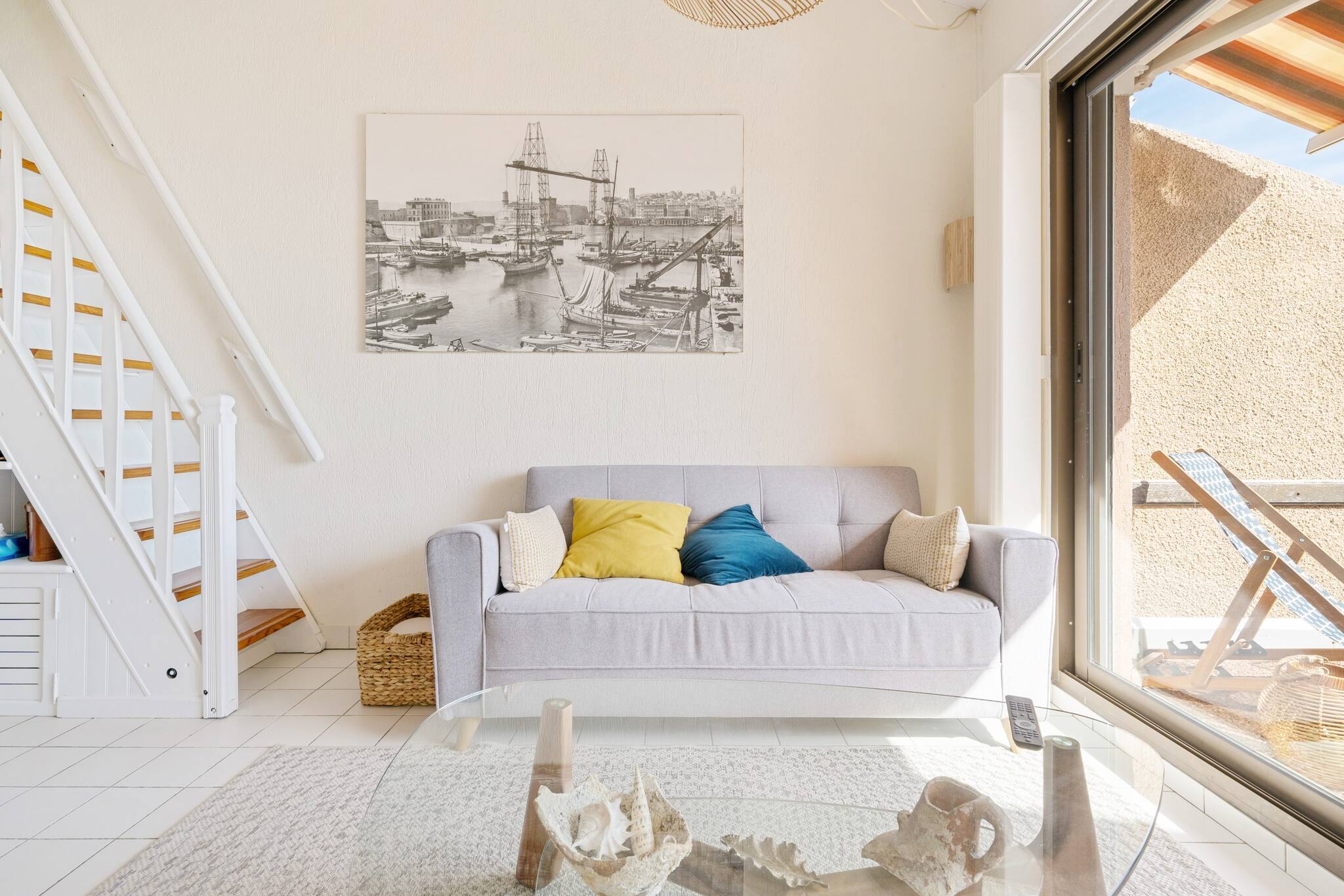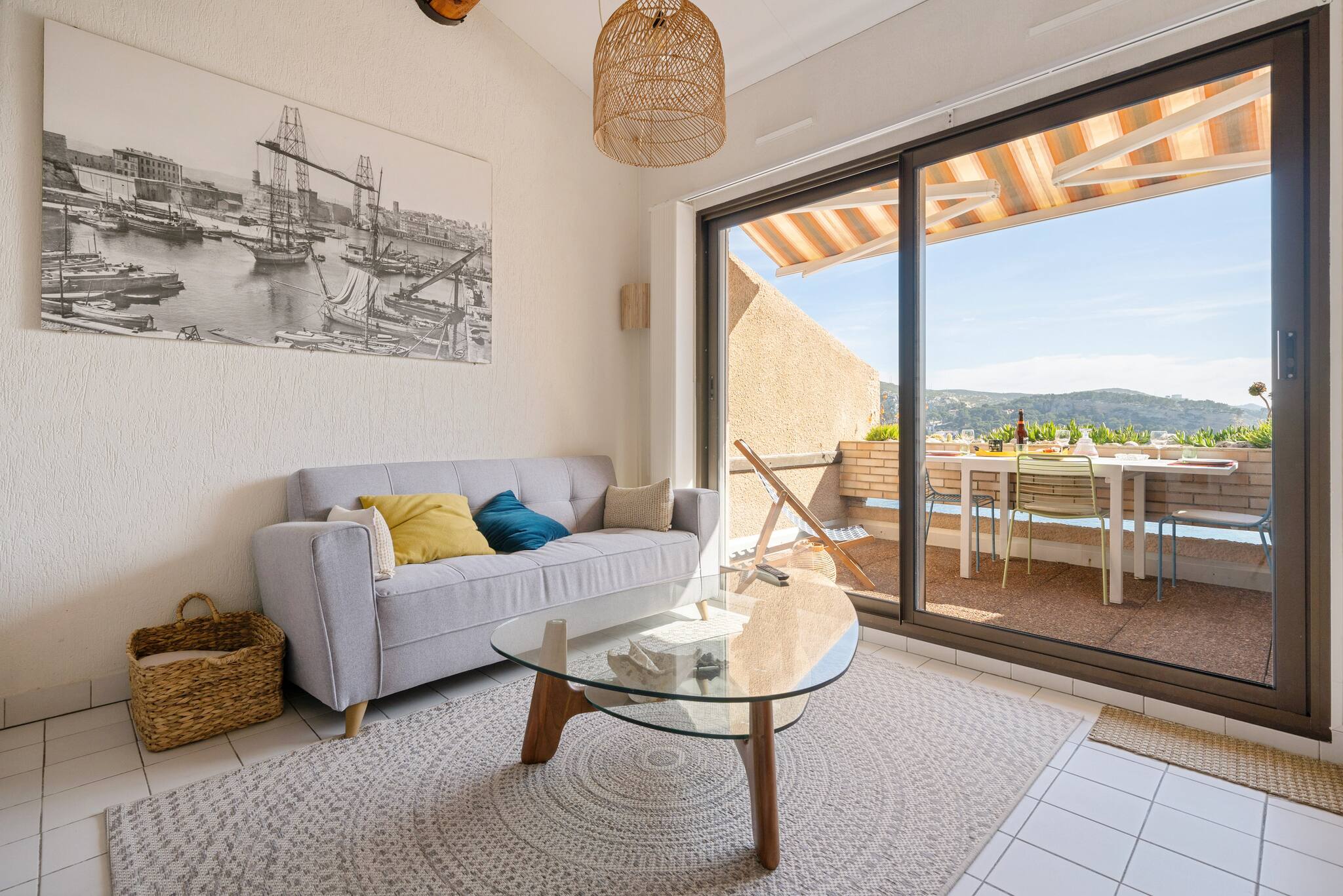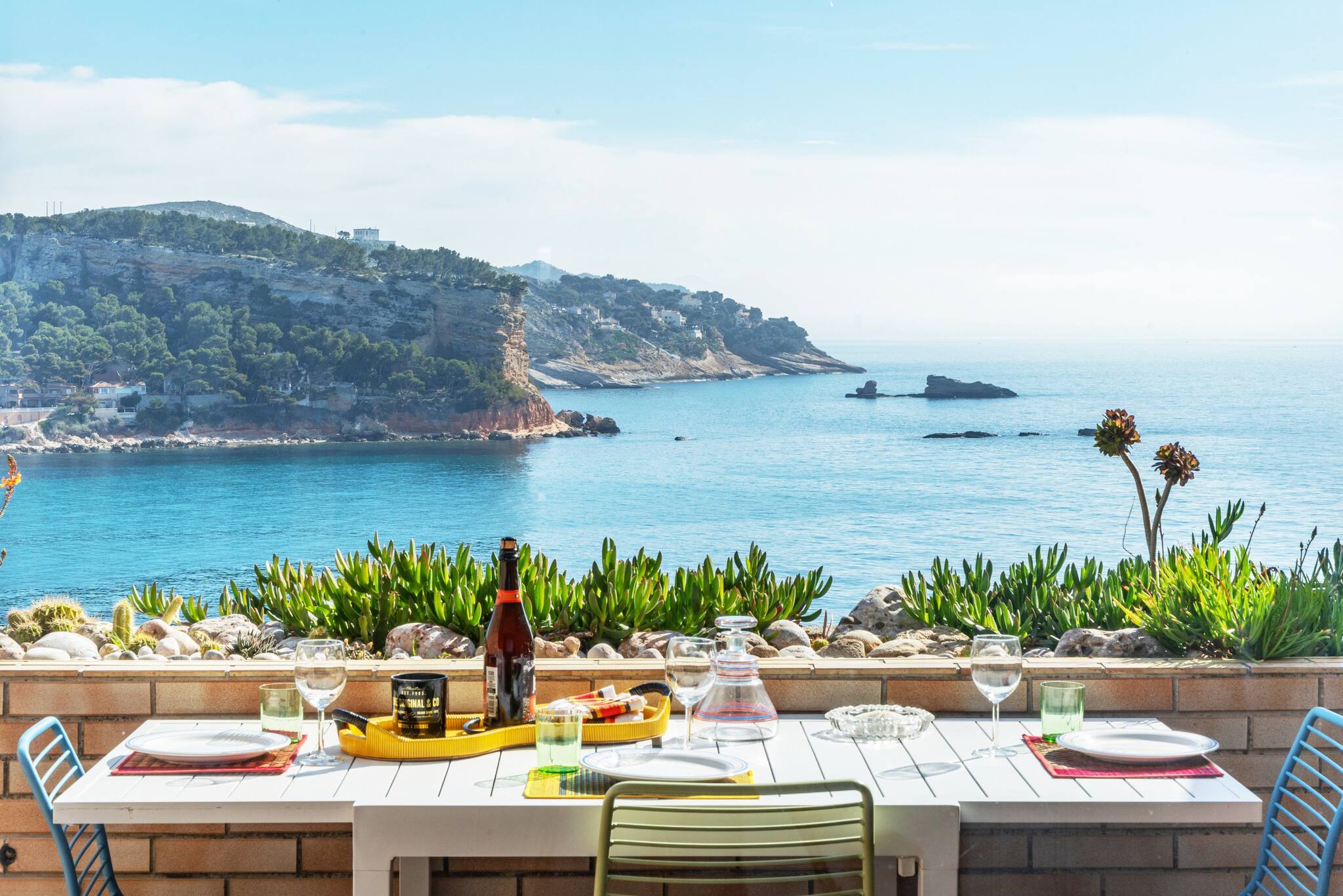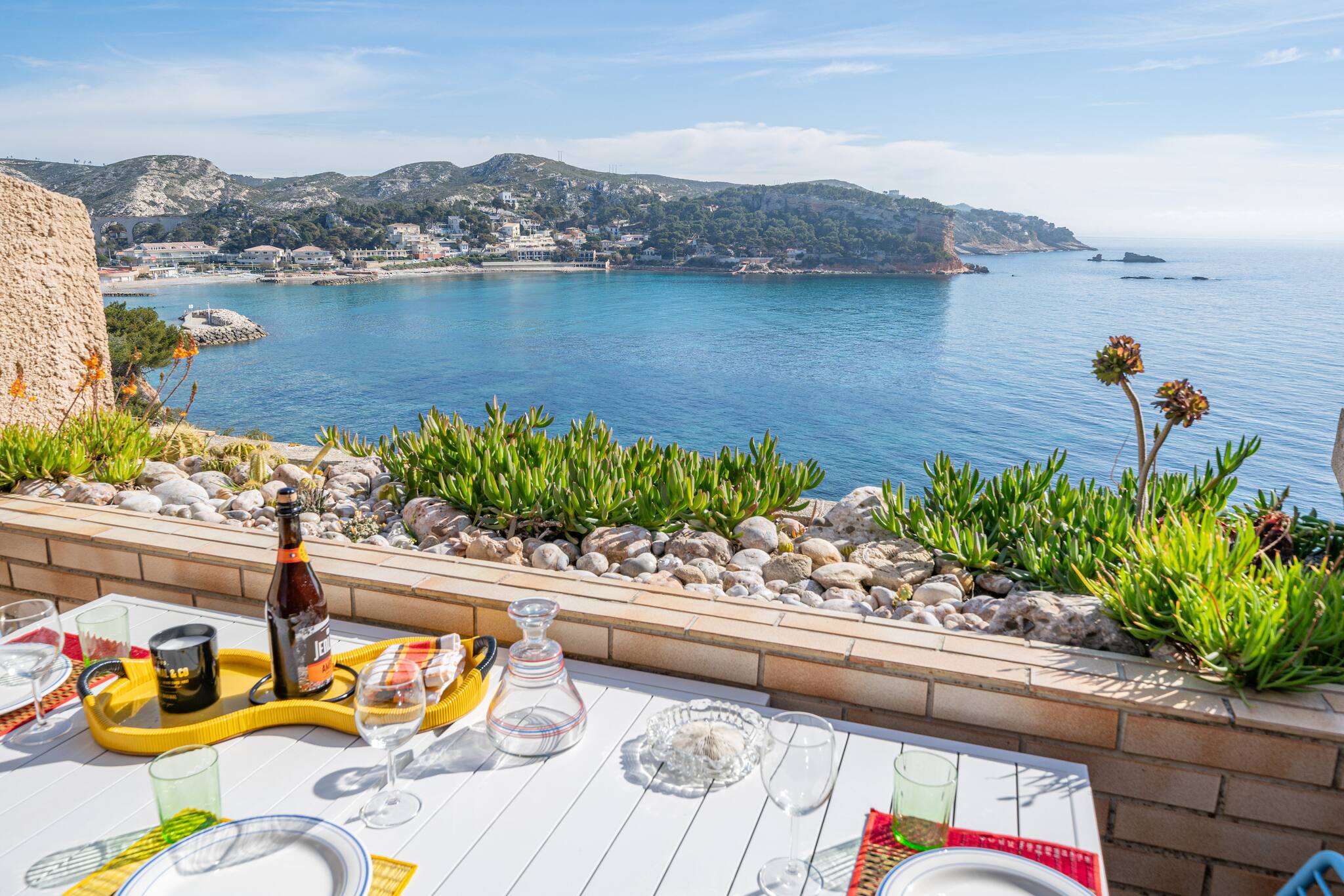 Terrasse plein sud vue mer, avec mobilier extérieur.