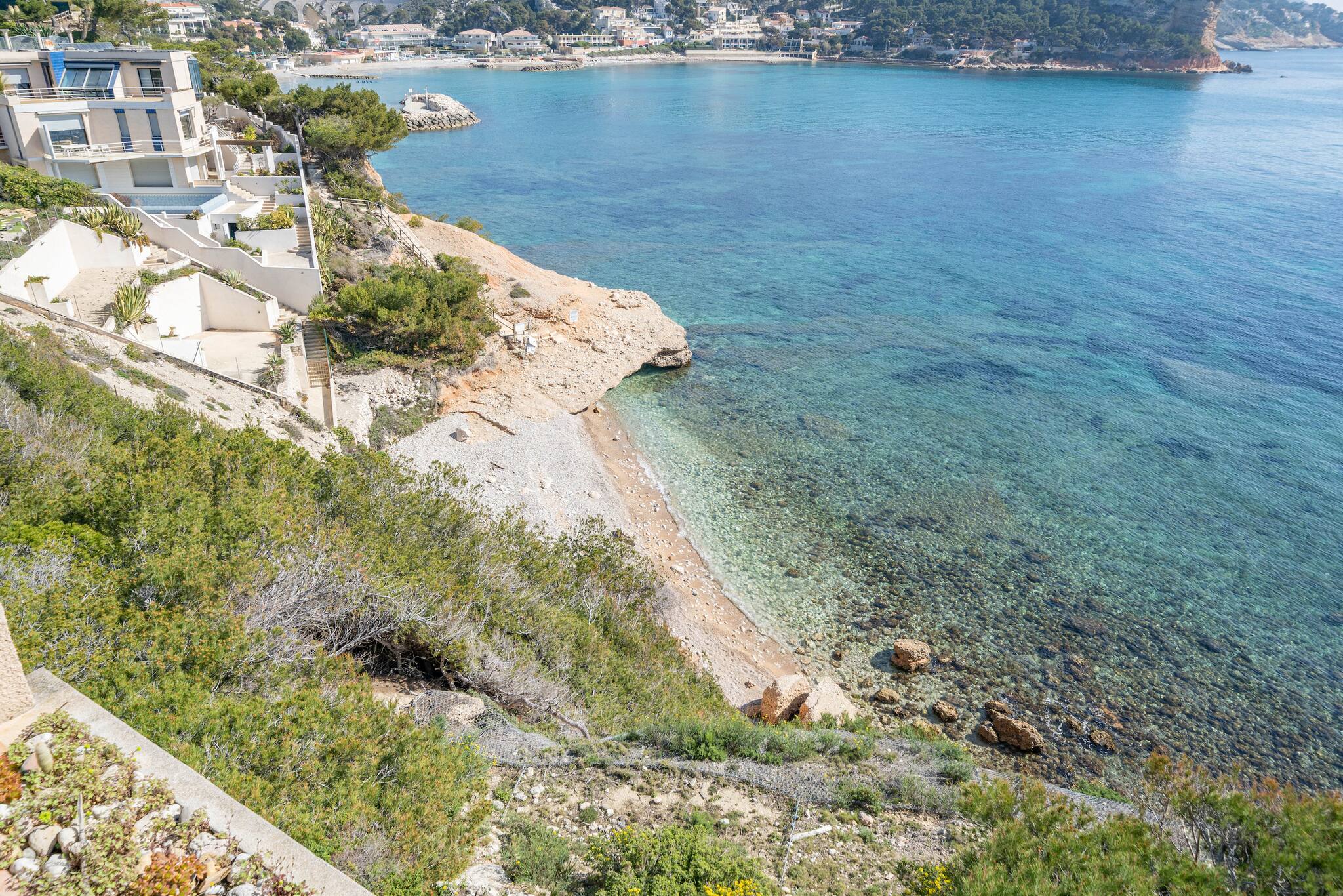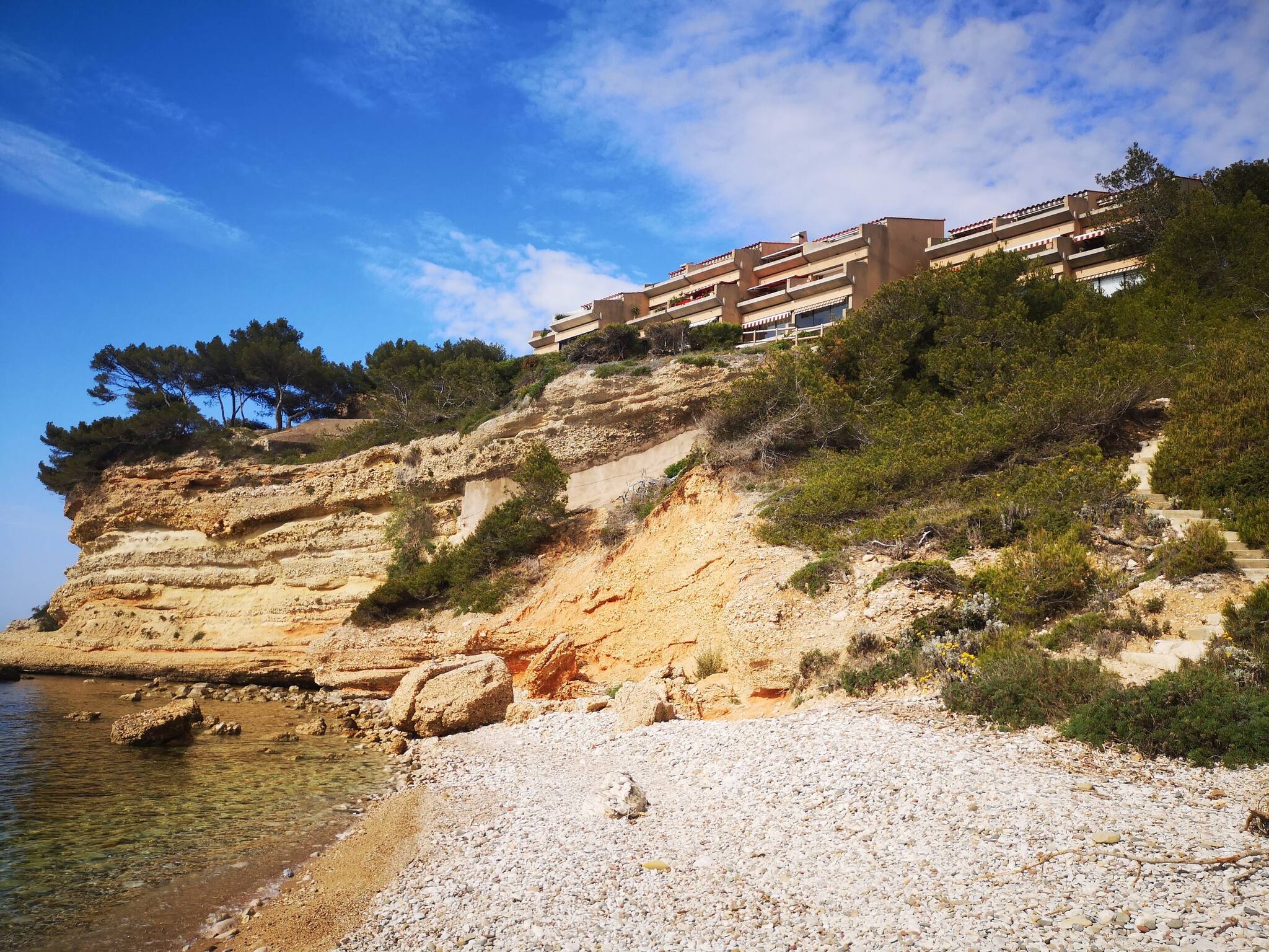 Accès privé par escalier à la calanque des Marines (plage de galets) située au pied de la résidence.