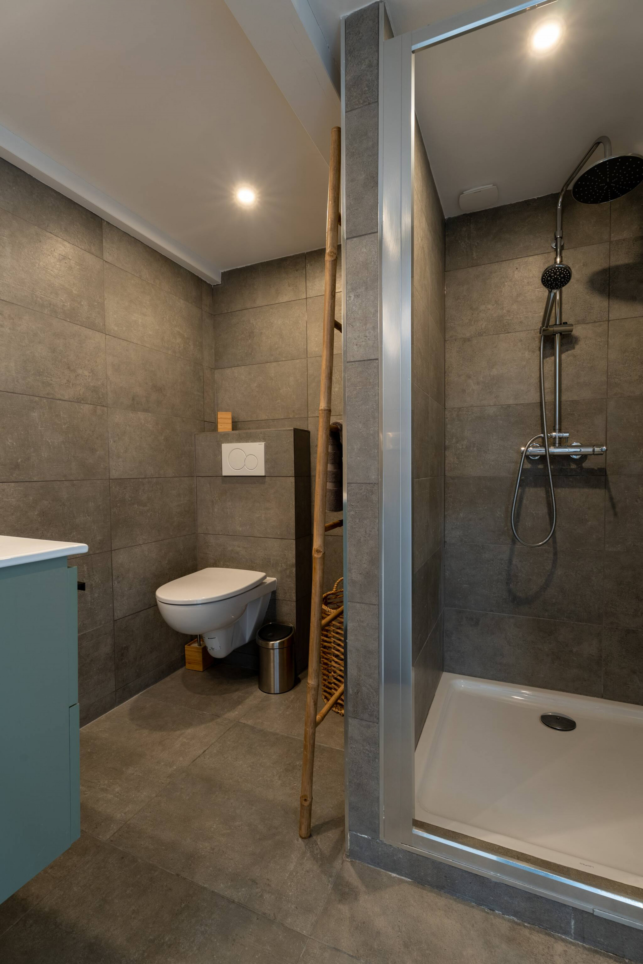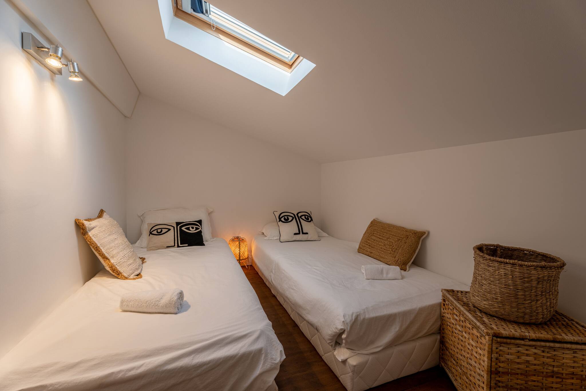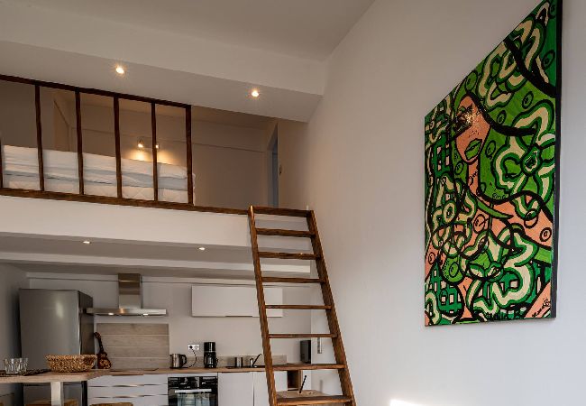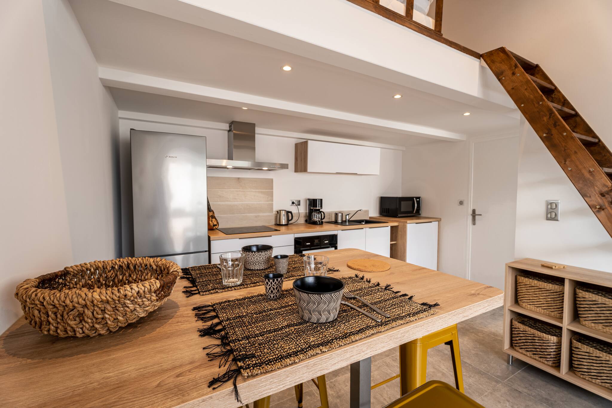 Le logement est composé d’une chambre avec lit double au Rez de chaussée avec cuisine et salle de bains , et la mezzanine contient 2 lits simples. Idéal pour un couple avec enfants.