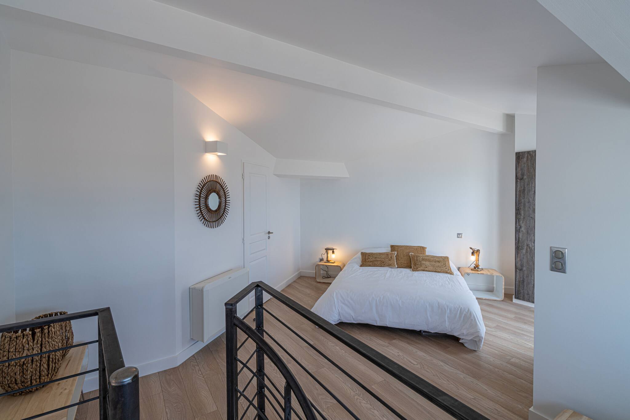 A l'étage: 2 chambres doubles fermées, 1 dortoir ( 3lits simples ) , 2 salles de bains, et un lit double situé entre une chambre et un dortoir.