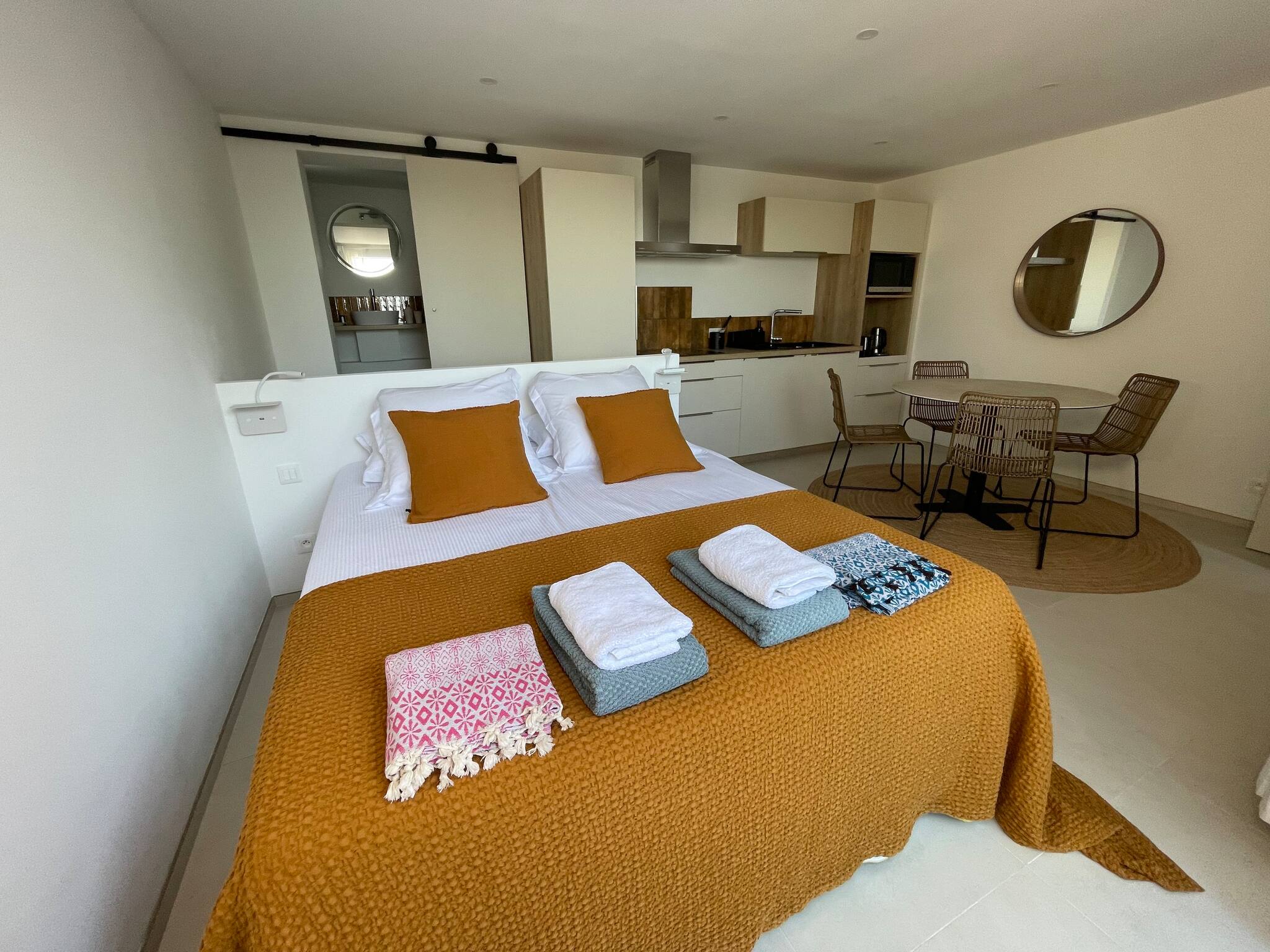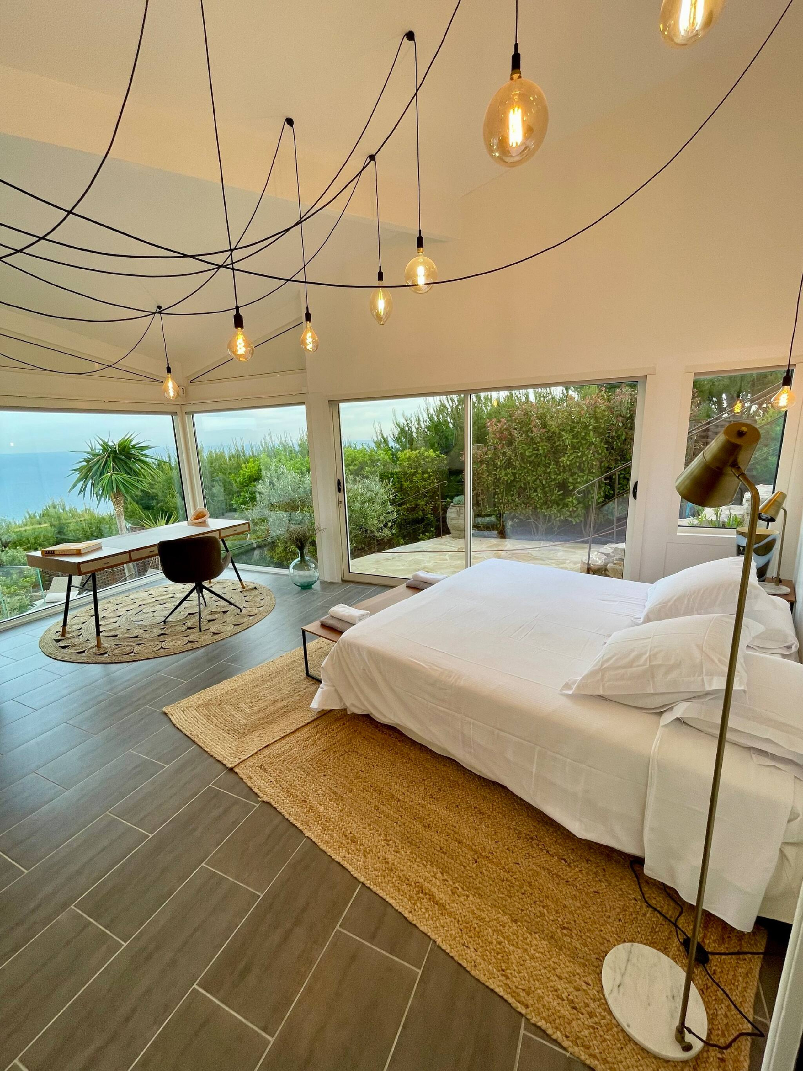 Toutes les pièces sont climatisées. 3 chambres avec 3 salles de bains vue mer. 1 Studio indépendant avec douche et cuisine , vue mer. 1 chambre d'appoint avec fenêtre sans vue mer dans ( pièce climatisée. )